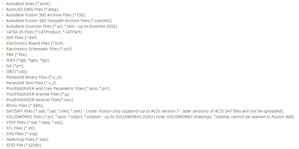 Autodesk Fusion importable file types: