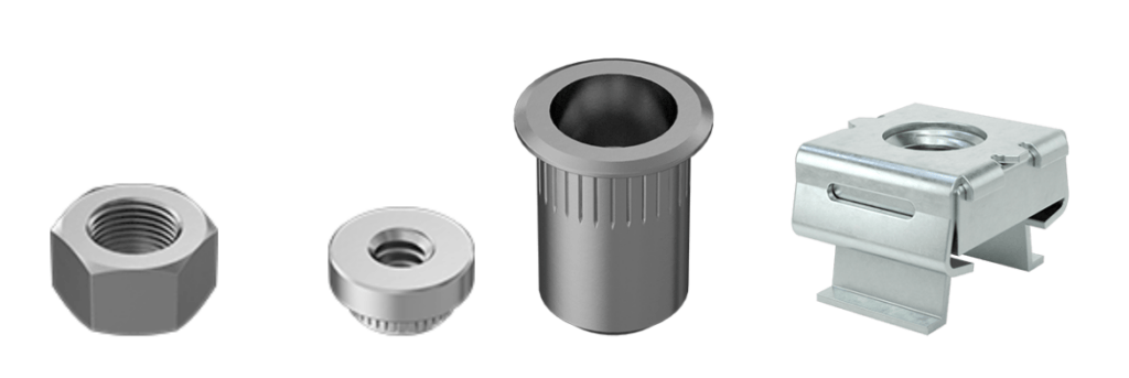 Nut is a bit of a blanket term for a female threaded fastener. They come in a lot of different styles from simple hex nuts to captive floating cage nuts. In general, a nut will be used with a similarly sized male threaded fastener, whether that’s a loose bolt or a stud. Nuts can be loose like a bolt or captive like a stud. Similar to studs, they can be permanently secured or semi-permanently attached to parts. Semi-permanently installed nuts can snap into round or square holes in thin sheet metal or they can press into precisely sized holes with twist-resisting serrations just like studs.