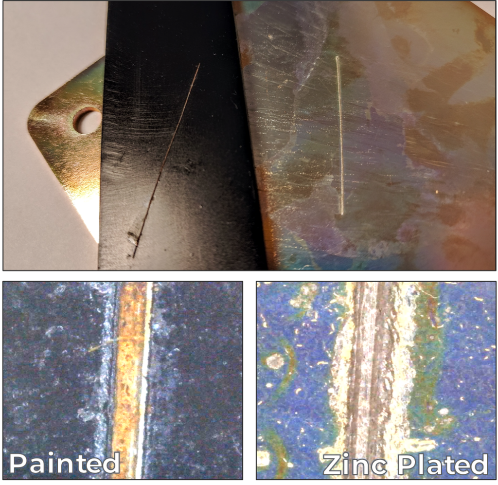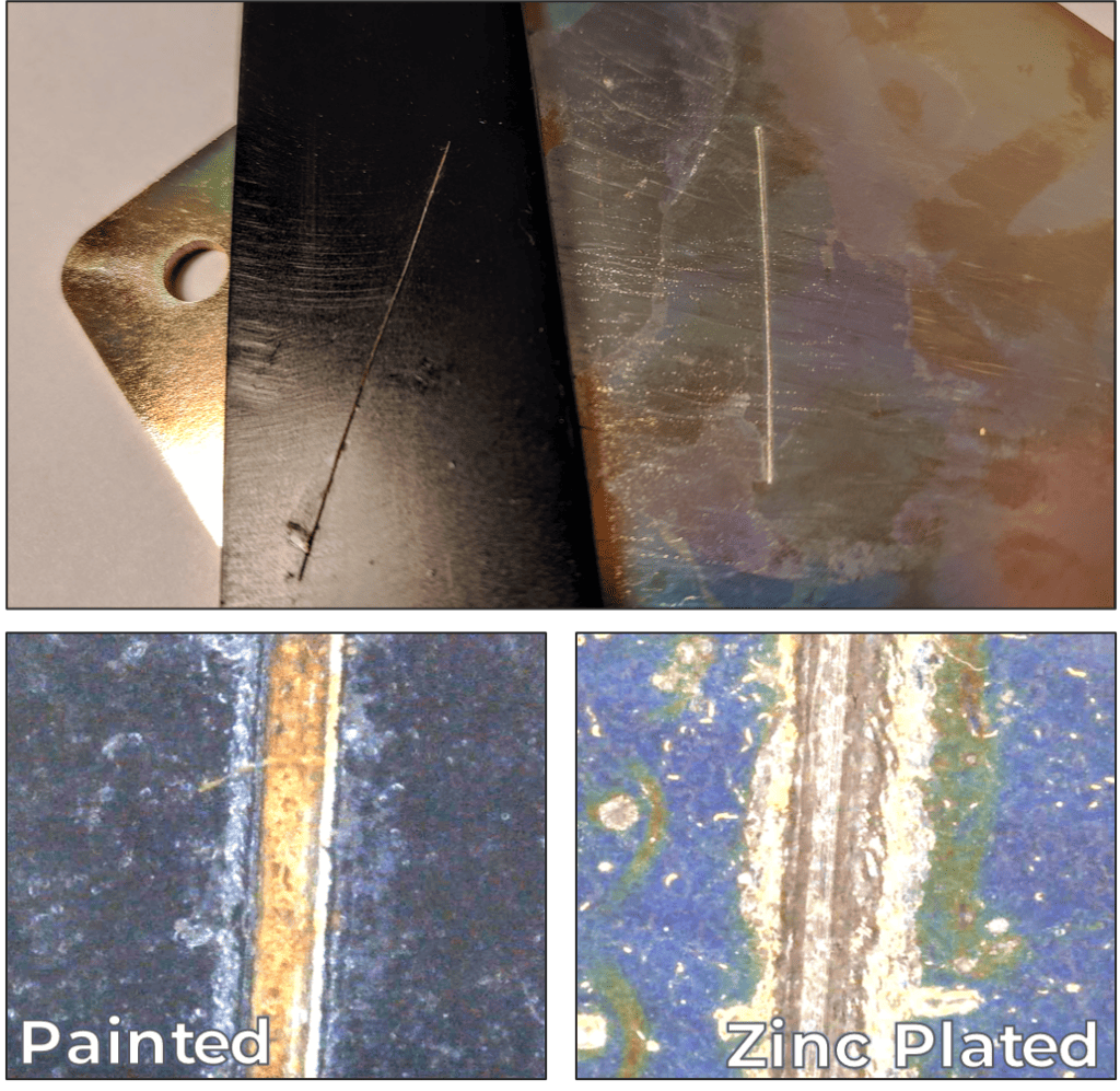 In the image above you can see an example of two steel parts, one painted and one zinc plated, both with a deep scratch. Both parts were exposed to identical environmental conditions (humid air) for the same amount of time. A close look at the scratch shows the painted part has rust forming on the exposed steel after only a short time. The exposed steel on the zinc plated part however is still relatively clean and rust free.