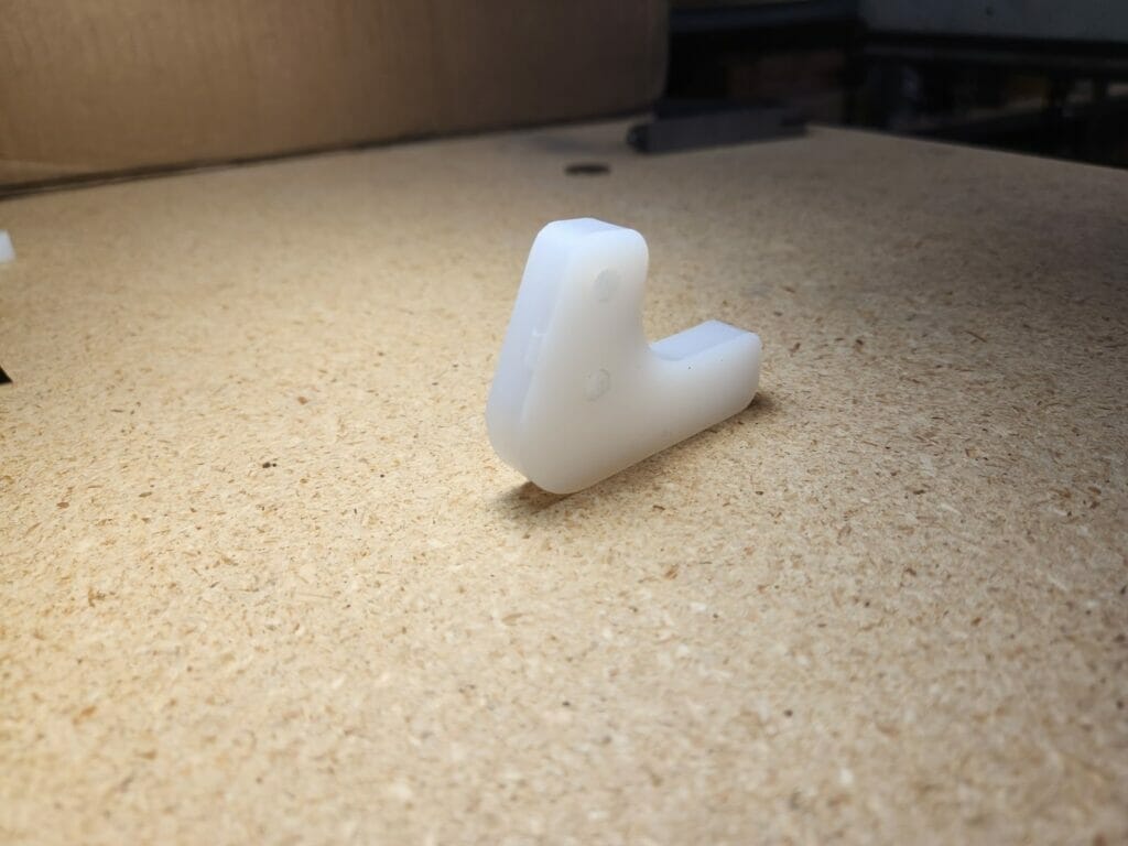 For the back of the assembly, a similar design with slightly different angles and leading curvature is used. To get an idea of how the UHMW part will look, it has been rendered below.