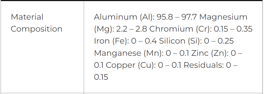 Material composition is simply what specific elements a material is made of. For example, 5052 aluminum is 95.8-97.7% pure aluminum, with various other elements added in, making it an aluminum alloy. Alloy simply means it is a mixture of two or more metals. The number “5052” is a specific alloy, which is comparable to a specific recipe that is published by an engineering organization. It designates that certain elements must be present, and in specific ratios to qualify as that particular alloy. These elements will impact how the material behaves. Some aluminum alloys are much stronger than others. For example, 5052 aluminum has an ultimate strength of 34 ksi, while 7075 aluminum has an ultimate strength of 81 ksi. Despite the fact that both materials are at least 87% identical, this last 13% of the composition results in more than double the ultimate strength.