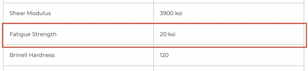 The classic example of this is a paperclip. If a paperclip is bent straight then folded back repeatedly, eventually it fails where it was being repeatedly bent. This failure mode is fatigue. When it comes to material properties, fatigue strength is a stress level that can be endured for a particular number of cycles. The higher the cycles, the lower the fatigue strength will be, until an infinite life fatigue stress value is reached. The fatigue strength listed on our materials page is for infinite life cycles. Here’s an example from the material details on 2024 aluminum.