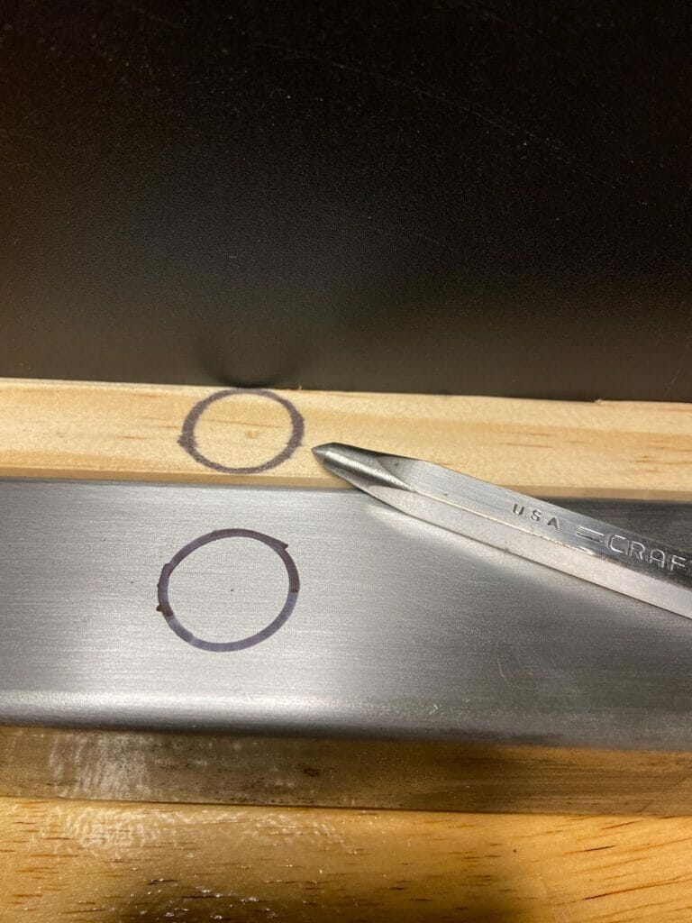 Within the two circles above, the punch was pushed into the materials with the same level of force. Note that the much softer wood is indented, while the harder steel is barely scratched.