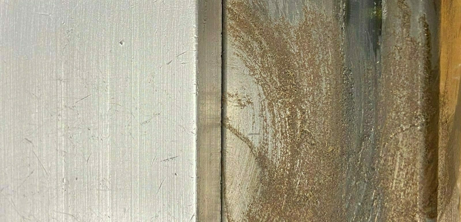 The material on the left, aluminum, creates a protective oxide layer very quickly. While the material on the right, mild steel, rusts over time via a corrosive oxide layer.