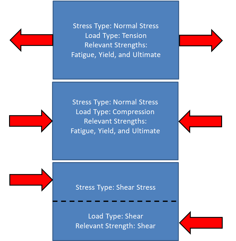 Above the three main types of simple loadings are outlined. The difference between compressive and shear stress is that the shear stress forces are offset from each other, in contrast to directly opposing each other. The dotted line in the shear stress diagram indicates the shear plane, or the center between the two opposing forces.