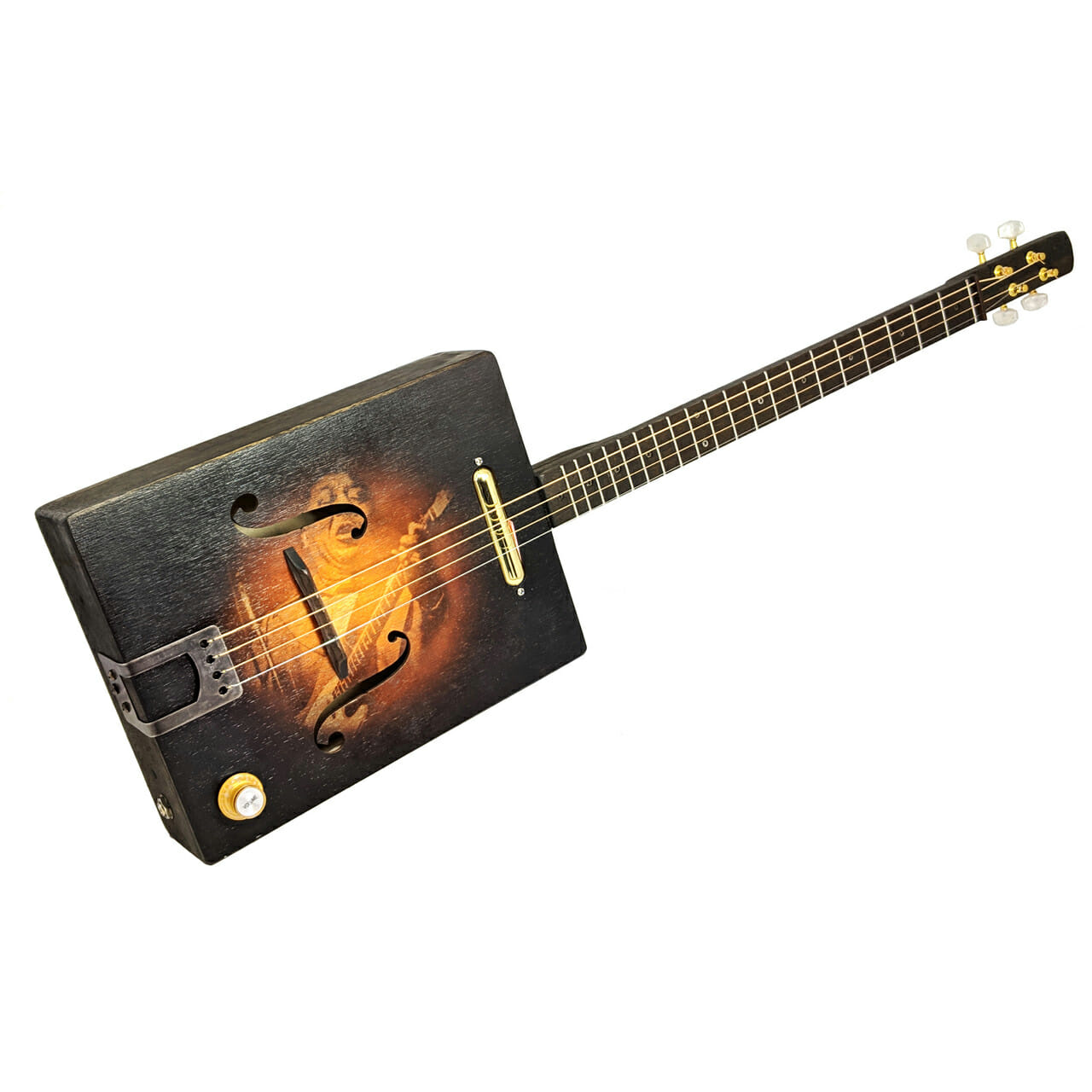 A easy to build and fun to play electric cigar box guitar kit, configurable with three or four strings.
