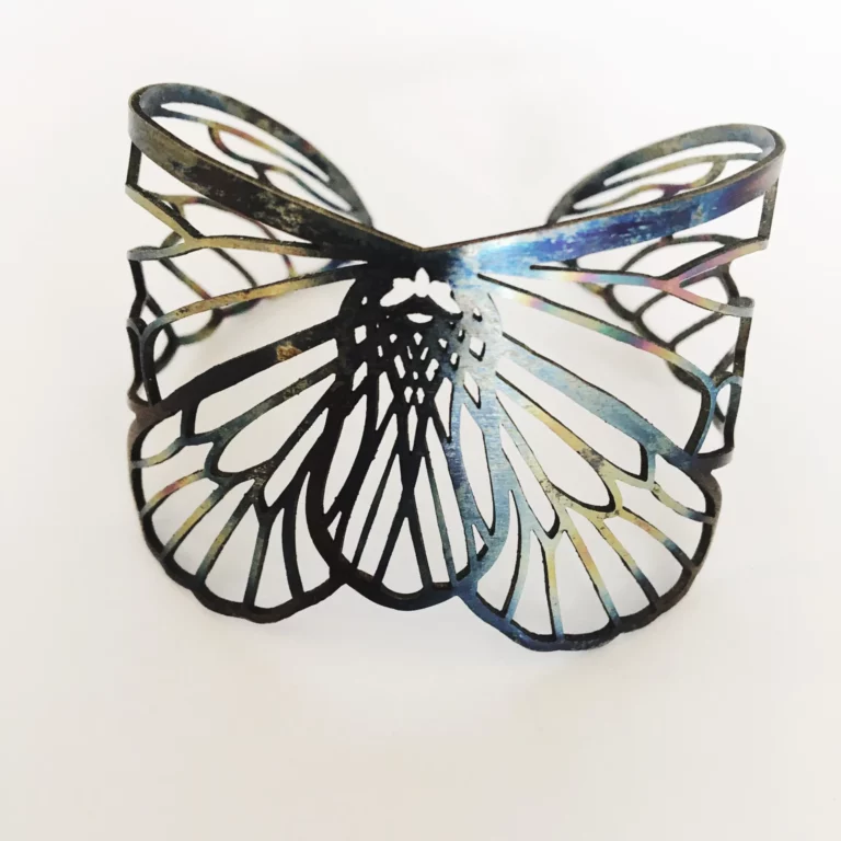 SendCutSend’s Contribution: This design was so intricate, and titanium is so hard, it would have been near impossible for me to hand-pierce this piece as I normally would with sterling silver. SendCutSend not only helped me with laser-cutting, but also advised me on the best choice of titanium to use for the bending and the addition of botanical details and patina I wanted to create.