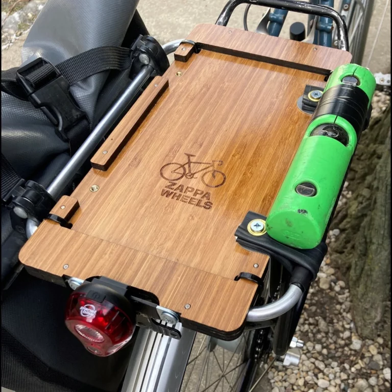 SendCutSend’s Contribution: The aluminum spokes guard on the ZappaWheels bicycle cargo shelf is laser cut by SendCutSend.