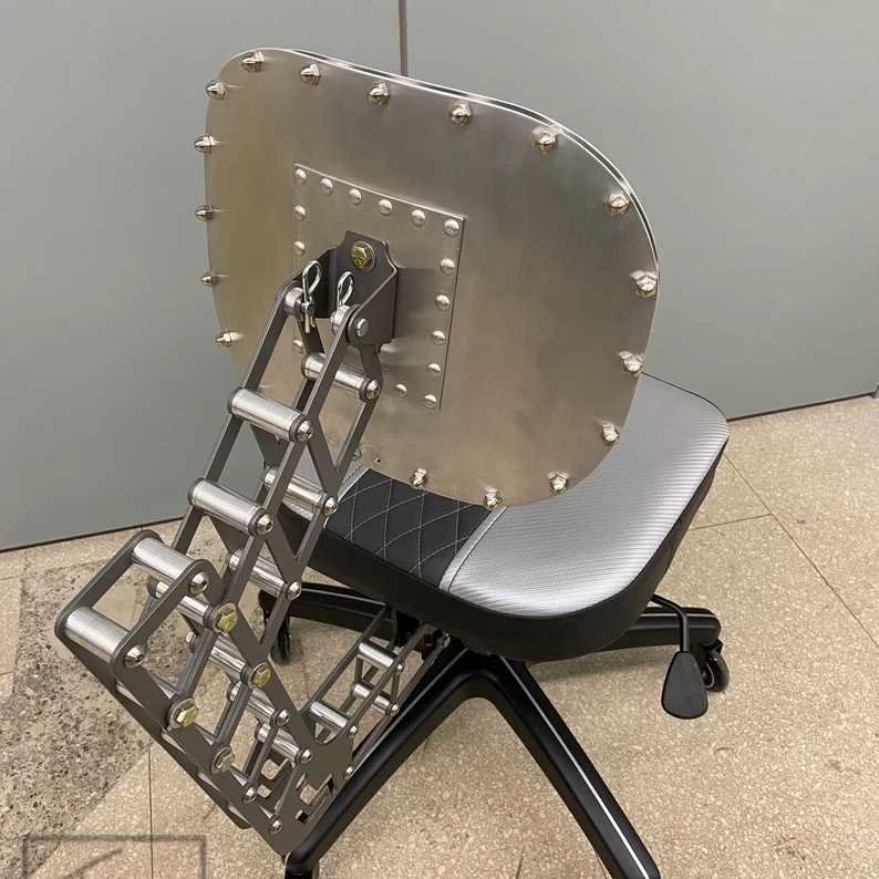 One of a kind desk/task chair with laser cut backrest, custom upholstery, and custom paint work.