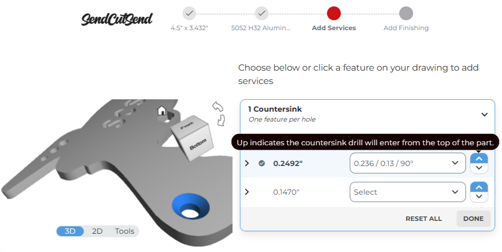 Our hole operation services can be added to the top or bottom face of sheet and plate stock, and holes will be cut all the way through the material. You can choose which side you want the service performed on (e.g., which way you want countersinks, dimples, or hardware oriented) before checkout.