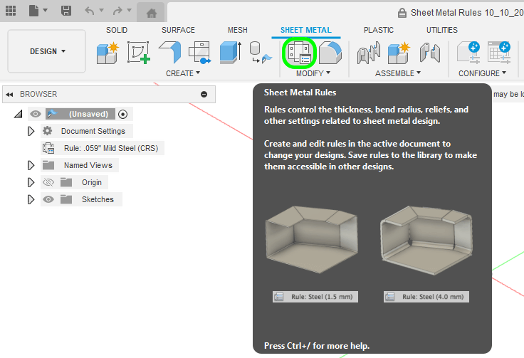 - Go to Sheet Metal tab → Sheet Metal Rules