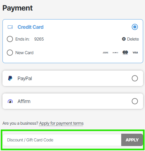 - At the Payment stage of checkout, look for the Discount / Gift Card Code field.