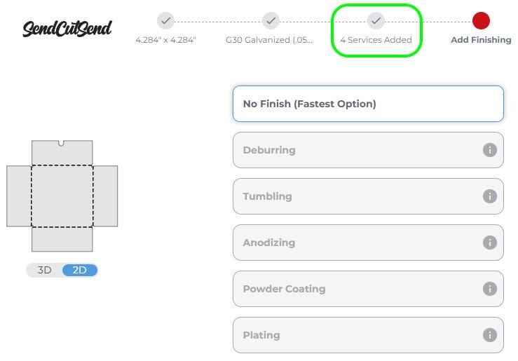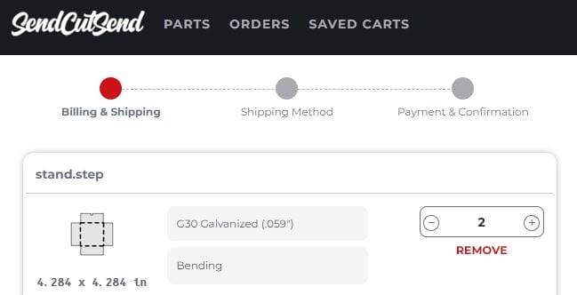 1. Upload your STEP/STP file to SendCutSend’s website and choose a material that is eligible for bending services. See our Bending and Forming Design Guidelines if needed.