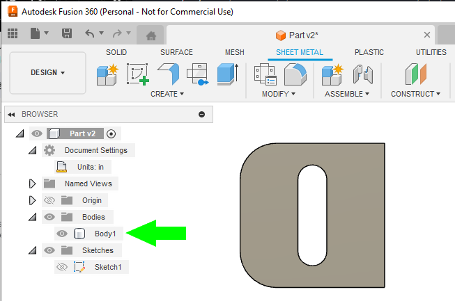 If you start your design by drawing a solid rather than a sketch, then the shape will already be a Body by default and you won’t need to extrude it. Please note, Bodies must have a uniform thickness to be converted to sheet metal, so rounded objects won’t work.