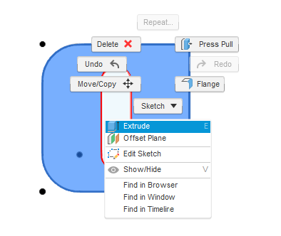 To do this, you can either right-click on the face of your sketch and choose Extrude from the menu, or simply press E.