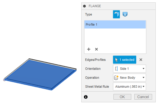 2. Select the Profile, choose the desired Sheet Metal Rule from the dropdown menu, and click OK.