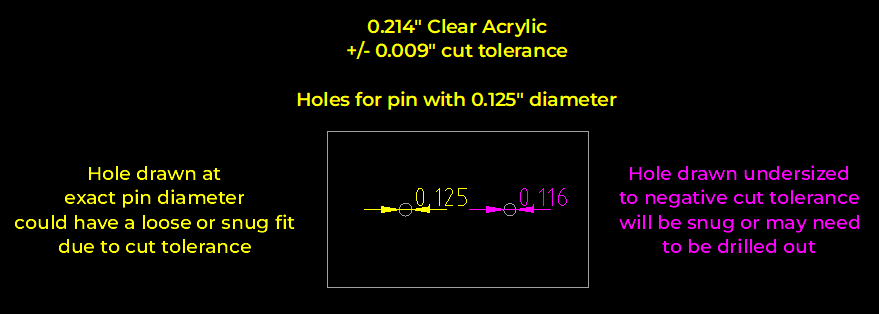 If you need pins or bolts to fit into circular holes in your parts, we recommend under sizing those holes by referencing the negative cut tolerance for the material of your choice. This is especially relevant if a close fit is critical for your application or you plan to press fit hardware into holes. When your parts arrive, if the pins or hardware do not fit into the holes you can ream them out if necessary.