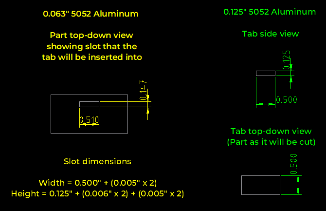 In a nutshell, a slot’s size is impacted by the tab’s material thickness and cut tolerances. For joints that need to consider this, you can use the following rule of thumb: