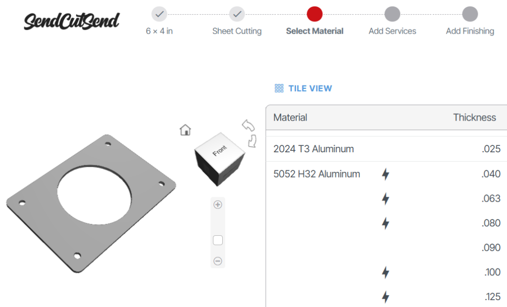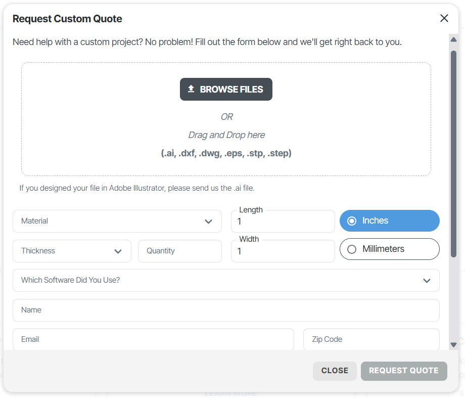 With our custom quote form, you can upload a part file and confirm details, including material thickness desired and the CAD software used to create the file.