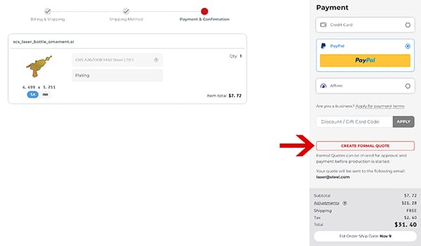 Our Formal Quote payment method makes it easy for you to build a quote and generate a PDF. Please note, when you create a Formal Quote, the parts will not move into production until payment is submitted.