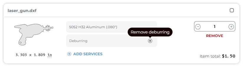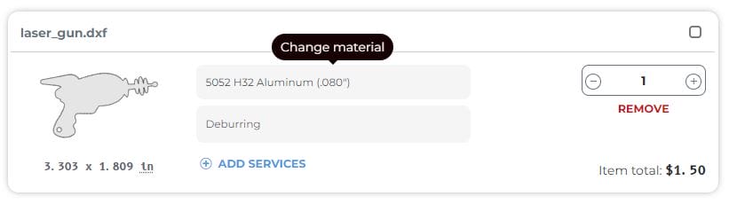 To make changes to parts in your shopping cart before checking out, on the line item, simply click on the material or any services to make changes. You can also hover over services to access the option to remove them. We have more details about this here!