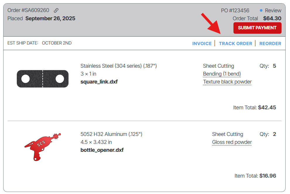 - Log into your SendCutSend account, finding the order in your Orders tab, and clicking Track Order.