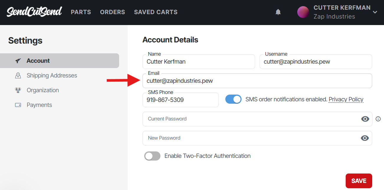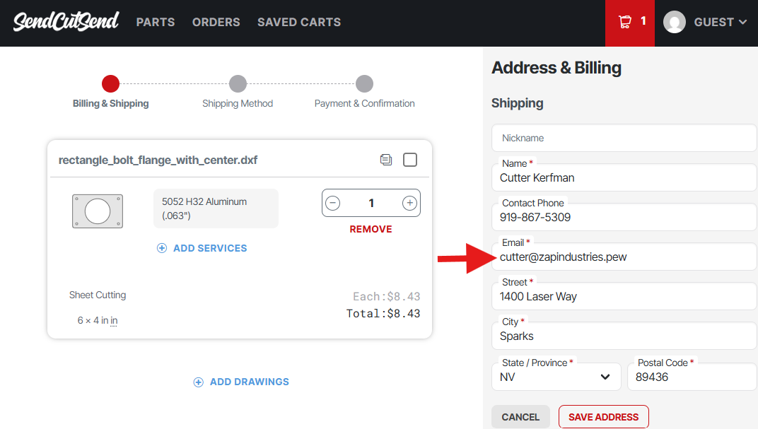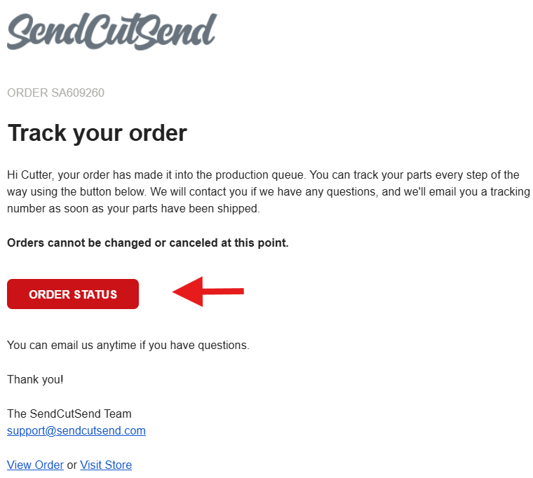 Whether you have set up a free SendCutSend account or checked out as a guest, the contact email address entered will receive order status updates.