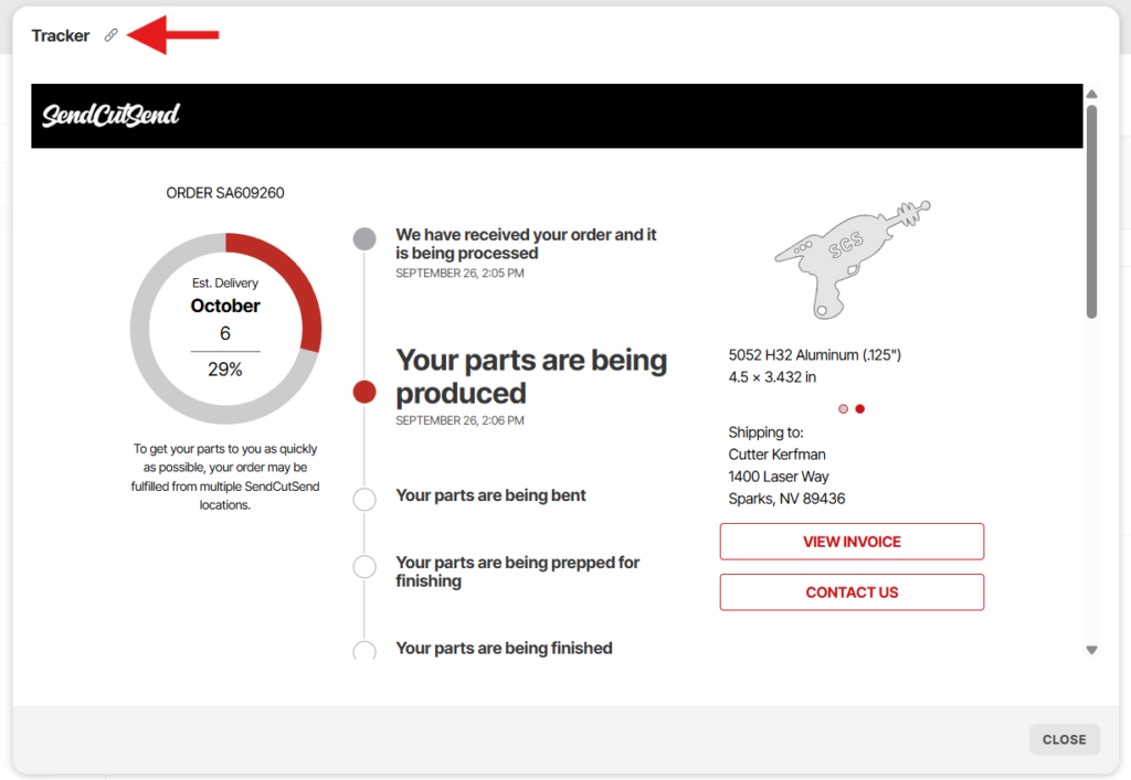 This will open the Tracker window where you can check the most up-to-date status of your order anytime. Here, you can also view your invoice, contact the SendCutSend Support team, or click the icon at the top left to copy a sharable link to view the tracker.
