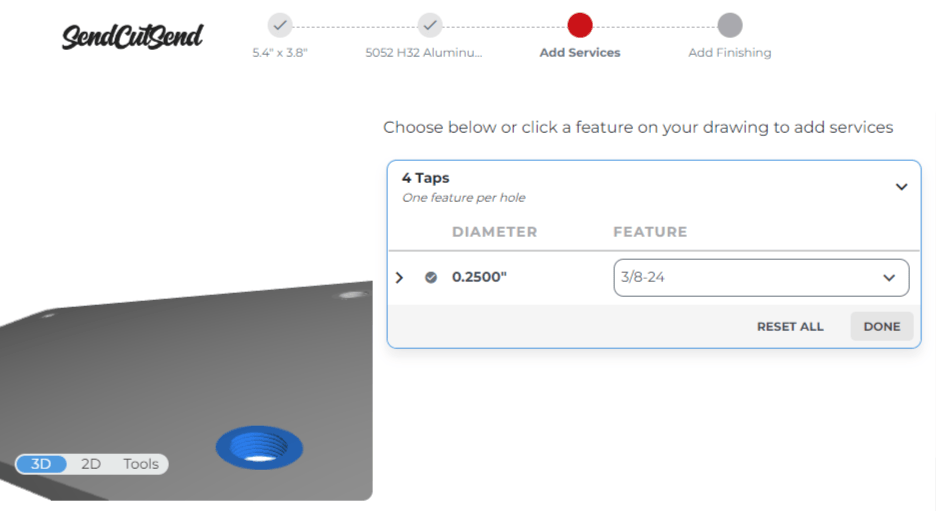 Keep in mind, we will automatically resize holes to perfectly fit the tap size you select while configuring parts in our quote system. Circular holes up to 4.00″ should be selectable for tapping services in eligible material thicknesses.