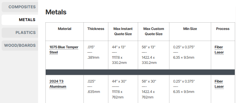 You can confirm sheet and plate part size limits on individual material pages in our Material Catalog, or in our handy charts.