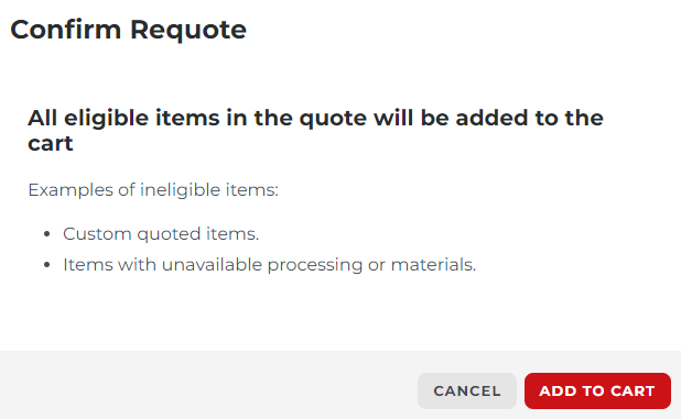 5. A window will appear asking you to confirm the requote; click Add To Cart.