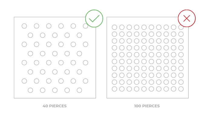 Each time hole or feature is created, the laser makes a pierce. The pierce can be the slowest part of the cutting process, and each pierce can be from 10 to 2,000 milliseconds, depending on the material. Those milliseconds add up, and can increase the cost of your part.