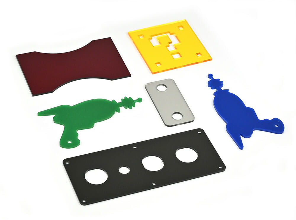 SendCutSend offers acrylic in 10 colors and five thickness options. Clear acrylic is available in .063″, .118″, .177″, .214″, .375″, and ,500″ thicknesses. Red, yellow, green, blue, grey, black, white, and mirrored acrylic are available in the .118″ thickness only.