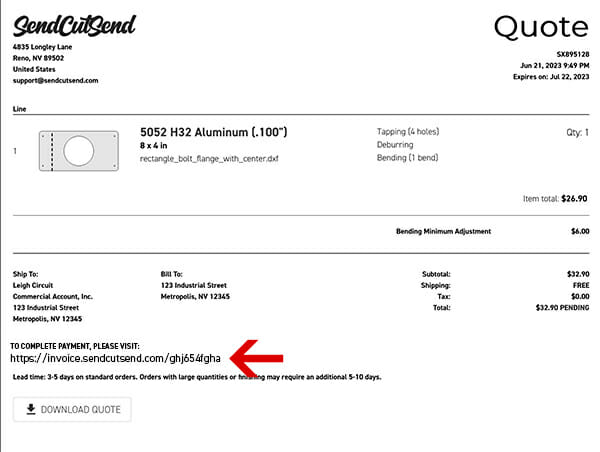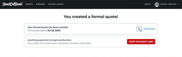 A Formal Quote creates a PDF quote of your order with a purchase link at the bottom of it as well as a direct payment link that you can send to your colleagues. Anyone can purchase the parts on a Formal Quote, but the billing and shipping information cannot be changed once the quote has been created.