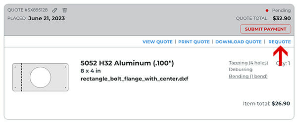 Shipping and billing details on a Formal Quote cannot be changed unless the project is requoted. To requote a project, go to the “Orders” tab, find the project associated with your quote, and click “Requote.”