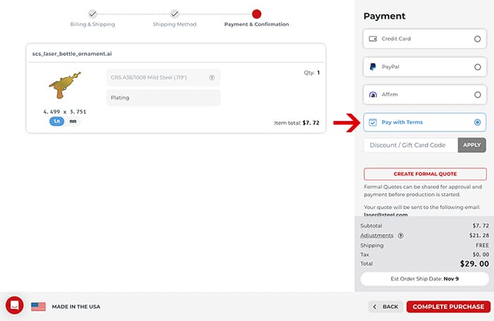 If you do not see a “Pay with Terms” option, please verify that you are signed into your SendCutSend account and reach out to us if the problem persists.