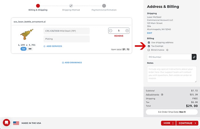 When you have your Net 30 account created, you can start ordering parts from SendCutSend using your Net 30 terms account. To do this, once your cart is complete, click the “Continue” button at the bottom of your screen.