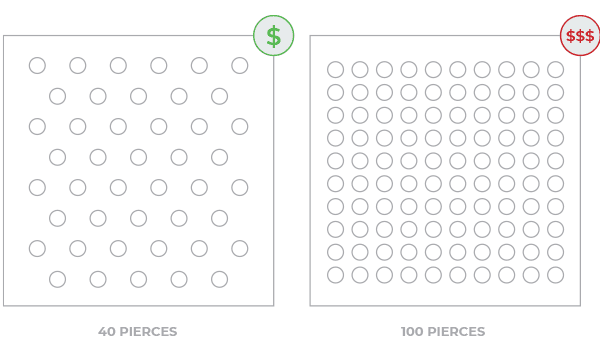 Each time a hole or feature is created, the laser makes a pierce. The pierce can be the slowest part of the cutting process, and each pierce can be from 10 to 2,000 milliseconds, depending on the material. Those milliseconds add up, and can increase the cost of your part.